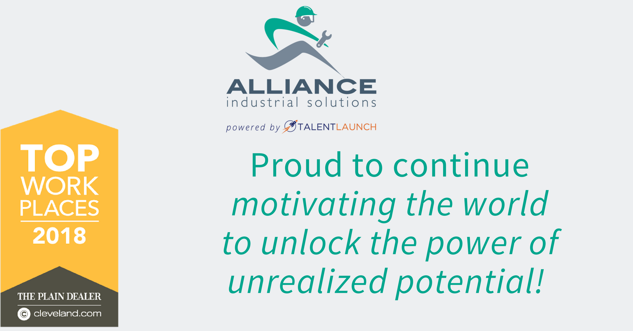 [et_pb_section][et_pb_row][et_pb_column type=”4_4″][et_pb_text]CLEVELAND, OHIO, JULY 19, 2018 — Alliance Industrial Solutions’ support company, TalentLaunch, has been awarded a 2018 Top Workplace honor by The Cleveland Plain Dealer. This is the network’s fourth consecutive year winning the award, and the fifth time since the award was established in 2006.