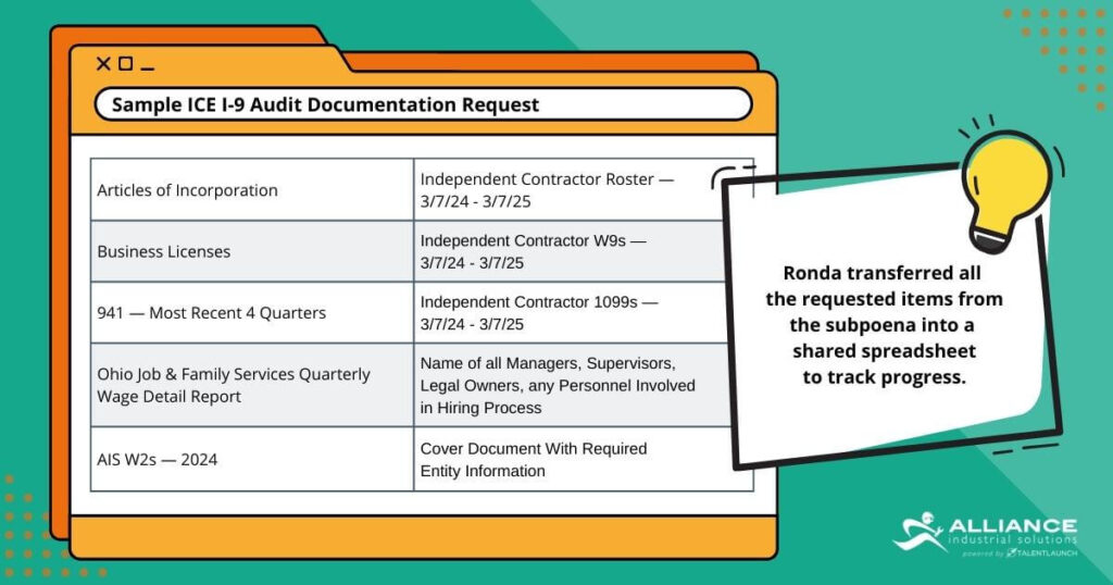 - Collect and Track Documentation: Ronda transferred all the requested items from the subpoena into a shared spreadsheet to track progress. This included hundreds of Form I-9s, plus records from E-Verify, Bullhorn (a network-wide talent database), and other internal applications.