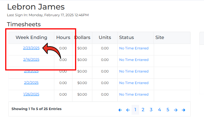 3. Then select the correct WEEK ENDING DATE to open your time card and enter your time for that week.